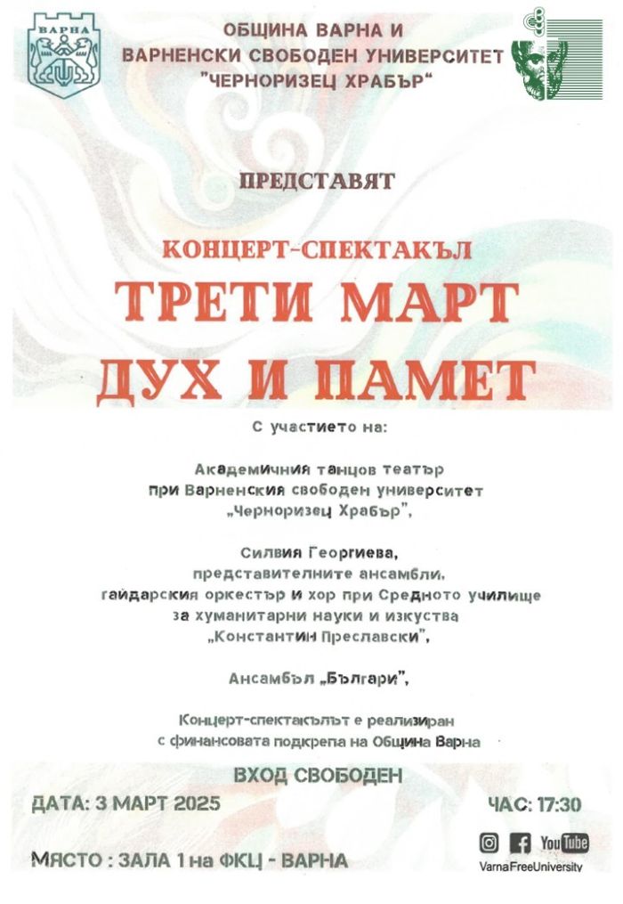Концерт-спектакълът „Трети март - дух и памет“, посветен на 147 години от Освобождението на България, ще се проведе на 3 март от 17:30 ч. в зала 1 на Фестивалния и конгресен център във Варна (Национален дворец на културата - конгресен център София" - Клон Варна). Събитието е част от празничната програма на Община Варна и се осъществява в партньорство с Варненския свободен университет „Черноризец Храбър".