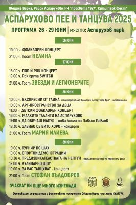 От днес до 29 юни Аспарухов парк във Варна ще бъде домакин на четиридневния фестивал „Аспарухово пее и танцува 2025“.