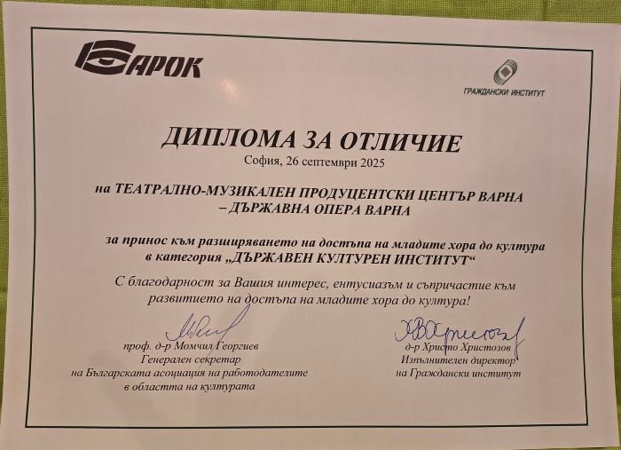 Новият 79-и творчески сезон на Държавна опера Варна започва с новината за току-що получената награда „ProCultura” 2025. Театрално-музикален продуцентски център Варна е отличен от Българската асоциация на работодателите в областта на културата БАРОК, в категория „Държавен културен институт", за принос в разширяването на достъпа на младите хора до култура. Дипломата се връчва за премиерната за 2025 г. постановка на операта „Фауст“ от Гуно с режисьор Вера Немирова и диригент Светослав Борисов.