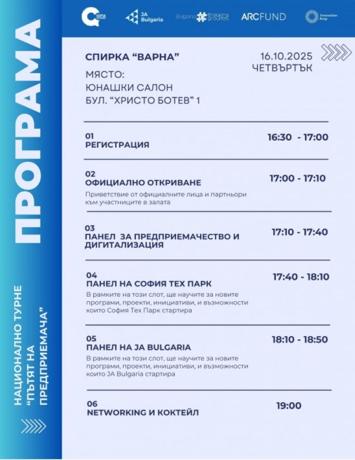 Варна е трета спирка от националното турне „Пътят на предприемача“ и ще бъде негов домакин на 16 октомври (четвъртък). Неговата цел е да събере предприемаческите общности от различни региони с водещи експерти и организации, които подкрепят стартиращи компании и млади таланти. Участниците ще имат възможност да чуят вдъхновяващи истории за успех, да получат практически насоки за стартиране и развитие на бизнес, както и да се запознаят с актуални програми за финансиране и подкрепа на иновативни проекти.