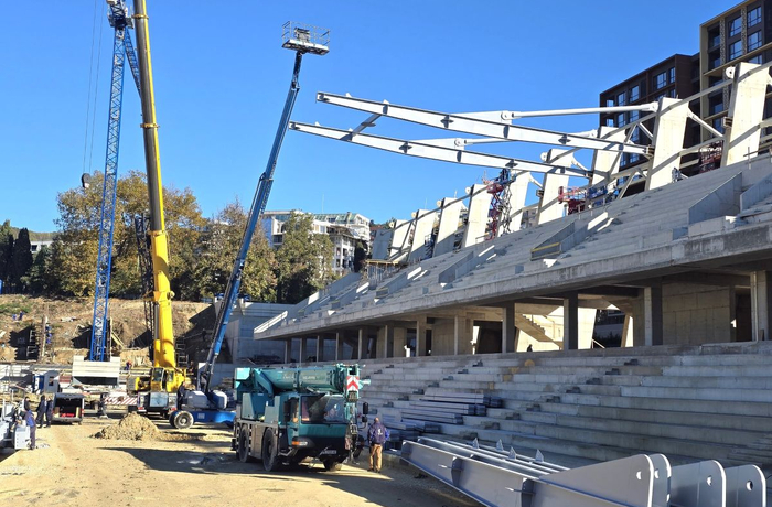 Кадри от монтажа на конструкциите за козирките на стадион „Арена Варна“ може да видите ТУК