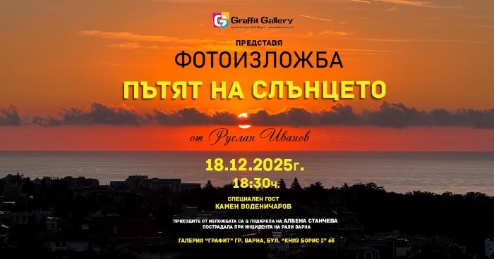В навечерието на светлите коледни празници Варна ще бъде огряна от една различна, по-топла светлина – тази на човешката доброта и на изгряващото слънце. Галерия „Графит“ ще бъде домакин на благотворителната фотоизложба „Пътят на слънцето“, която събира 45 впечатляващи изгрева над морето, заснети от един-единствен наблюдателен пункт. Зад обектива стои Руслан Иванов – 54-годишен фотограф, родом от София, но от години избрал да живее и твори край морето. В продължение на дълго време той снима стотици изгреви от едно място, а най-силните 45 кадъра намират своето място в тази изложба. Всяка снимка носи различно настроение, различен цвят и различна история.