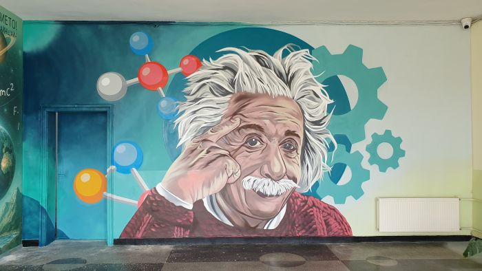 Част от проекта е и изрисуването на STEM кабинета, където учениците вече всеки ден се вглеждат в образа на Алберт Айнщайн.
