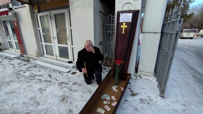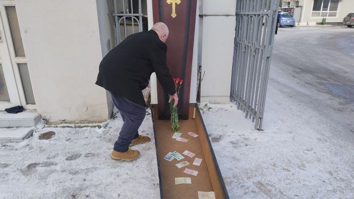С траурно настроение, но и с доза варненски хумор, днес пред Централните гробища във Варна местният зевзек Росен Марков символично „погреба“ българския лев.